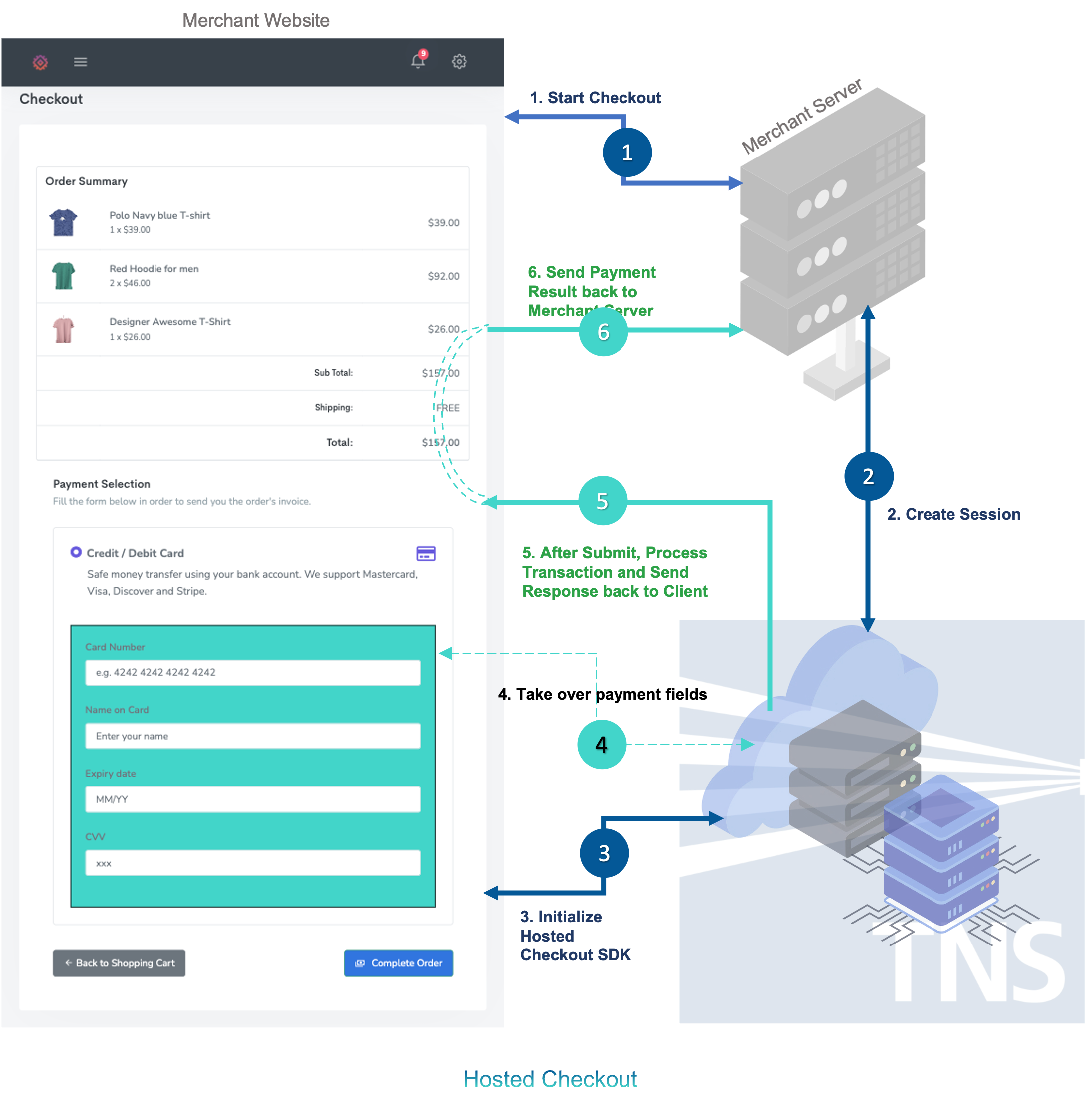 Hosted Checkout is a proprietary JavaScript SDK from TNS, designed to provide merchants with an iframe for seamless integration into their ecommerce websites. This integration facilitates secure online payments while keeping sensitive payment data out of the merchant's server. Rather than entering card data directly on the merchant's website, TNS handles the card data, enhancing security and compliance.